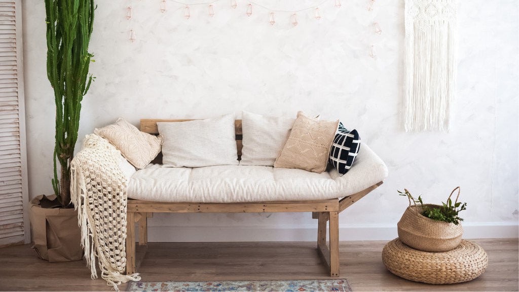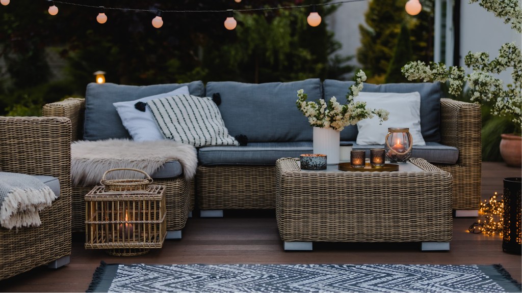Mix patterns and textures to add depth and intrigue to a space. Think printed cushions with textured throws. And decorative baskets made from woven material like sisal, seagrass, water hyacinth, and sometimes even rattan are cost-effective and an easy way to incorporate the raw, natural look both inside and out.