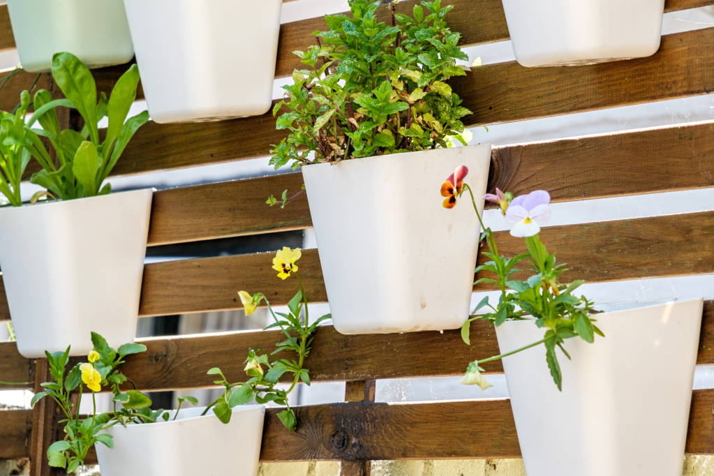 Attach small pots using hooks, brackets, or strong zip ties to a garden trellis panel. Or, hanging fabric pockets for an easier, lightweight option. Fill them with easy-to-grow herbs such as basil, parsley, or mint. Not only does it look great, but it also makes fresh herbs easily accessible for using in the kitchen.